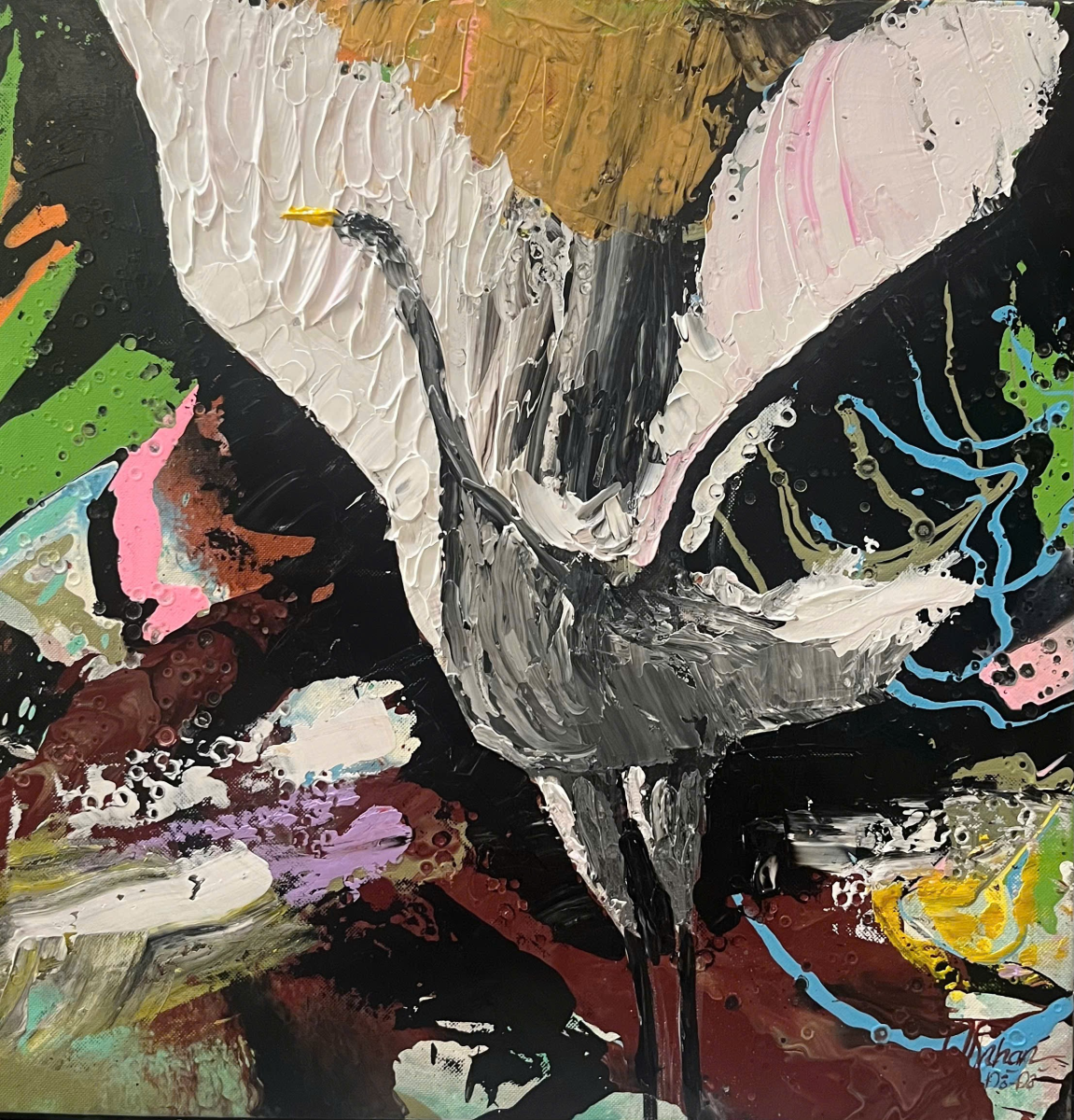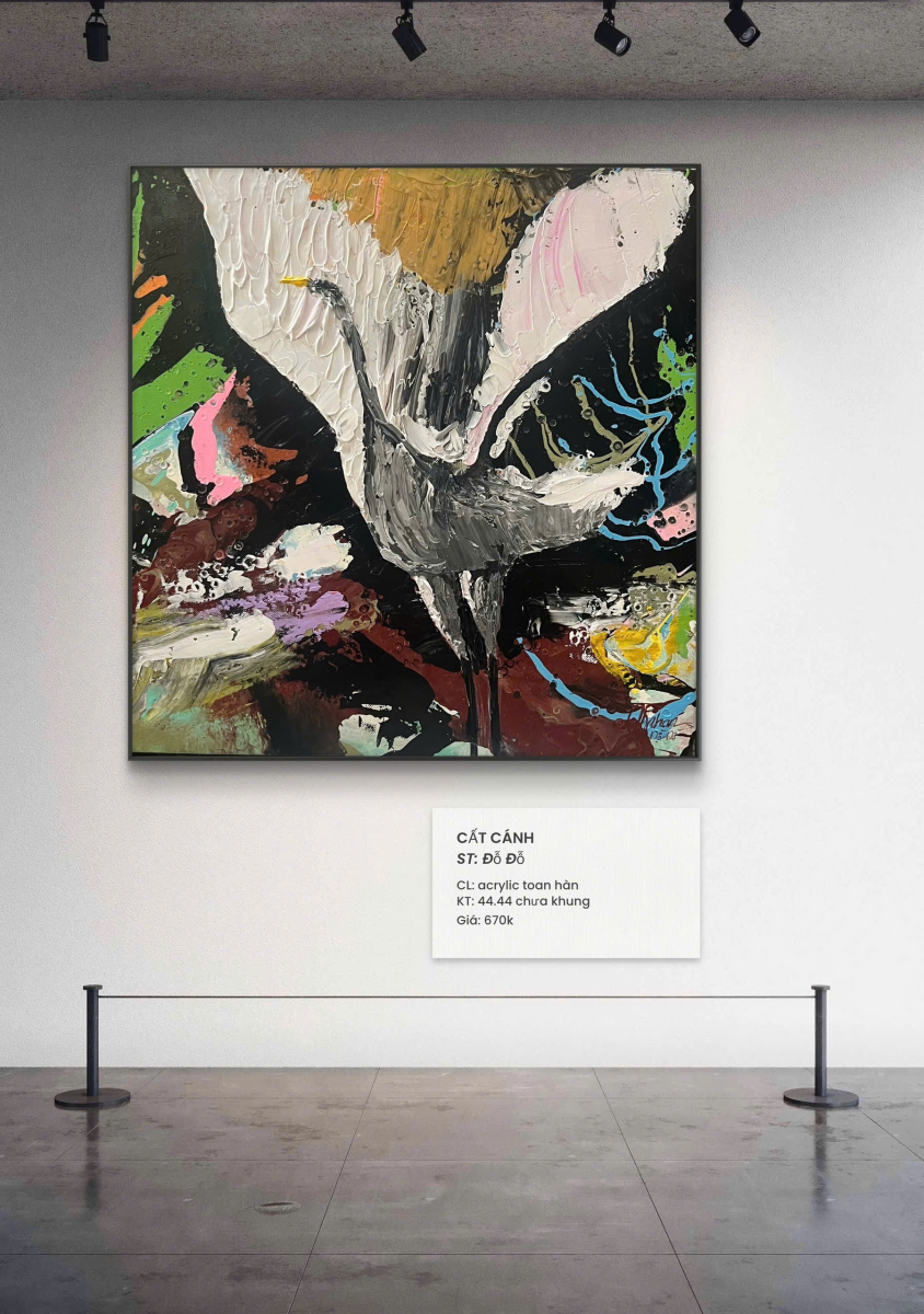Bức tranh "Cất Cánh" khắc họa hình ảnh chú chim vươn mình giữa những mảng màu mạnh mẽ, như biểu tượng của ý chí bứt phá. Những đường cọ phóng khoáng và sắc màu chuyển động tạo cảm giác năng lượng đang lan tỏa, gợi lên tinh thần dám bước khỏi vùng an toàn để bay lên tầm cao mới. Tác phẩm truyền tải thông điệp về khát vọng tự do, sự can đảm bắt đầu hành trình mới và niềm tin vào sức mạnh nội tại của mỗi con người.