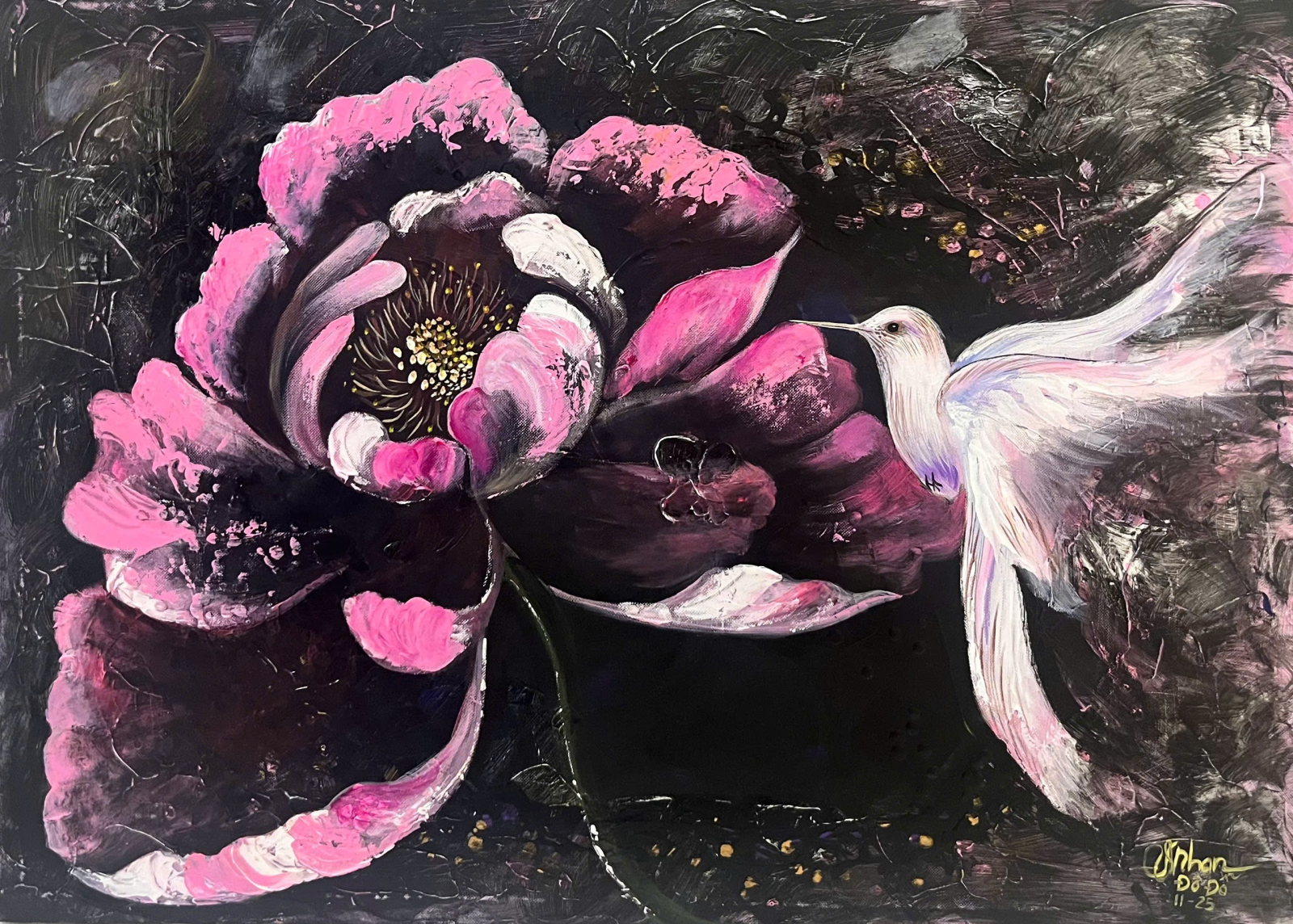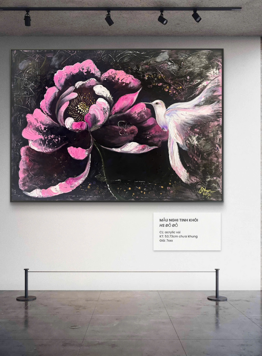 Bức tranh gợi lên vẻ đẹp thanh cao và sức sống mãnh liệt qua hình ảnh bông hoa rực rỡ đang nở bung giữa nền tối, như một nữ hoàng đầy phẩm giá. Cánh chim trắng khẽ chạm vào hoa tượng trưng cho sự thuần khiết, hòa bình và sự nâng niu của cái đẹp. Tác phẩm được họa sĩ Đỗ Đỗ truyền tải thông điệp về sự tinh khôi luôn hiện hữu ngay cả trong những mảng tối của cuộc đời, và vẻ đẹp chân thật sẽ tự tỏa sáng dù ở bất kỳ hoàn cảnh nào.