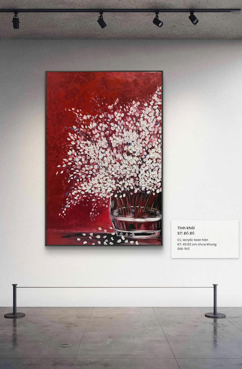 Bức tranh "Tinh khôi" gợi lên cảm giác thanh khiết và dịu dàng của những đóa hoa trắng trong chiếc bình trong suốt, nổi bật trên nền đỏ rực rỡ đầy sức sống. Sự tương phản ấy như biểu tượng cho vẻ đẹp thuần khiết giữa nhịp đời sôi động, mang đến cảm giác ấm áp và bình yên cho người xem.