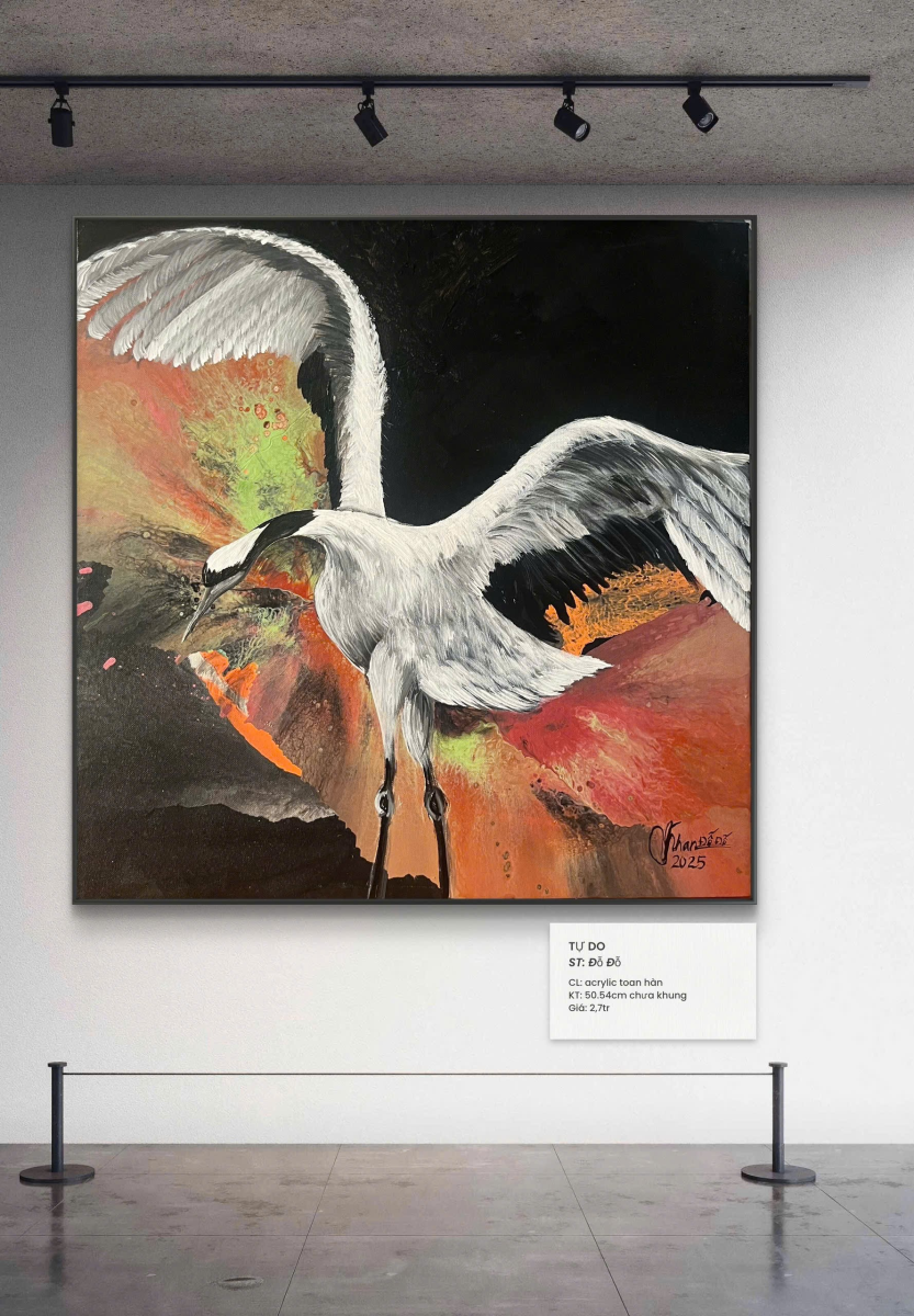 Tác phẩm khắc họa khoảnh khắc mạnh mẽ khi chú hạc dang rộng đôi cánh, vươn mình giữa nền màu rực lửa và bóng tối sâu thẳm. Hình ảnh ấy gợi cảm giác giải thoát - như thể vượt thoát khỏi giới hạn cũ để bước vào một không gian mới đầy ánh sáng. Sự tương phản màu sắc làm nổi bật tinh thần kiêu hãnh và ý chí bay lên, nhấn mạnh rằng tự do là hành trình bứt phá từ bên trong
