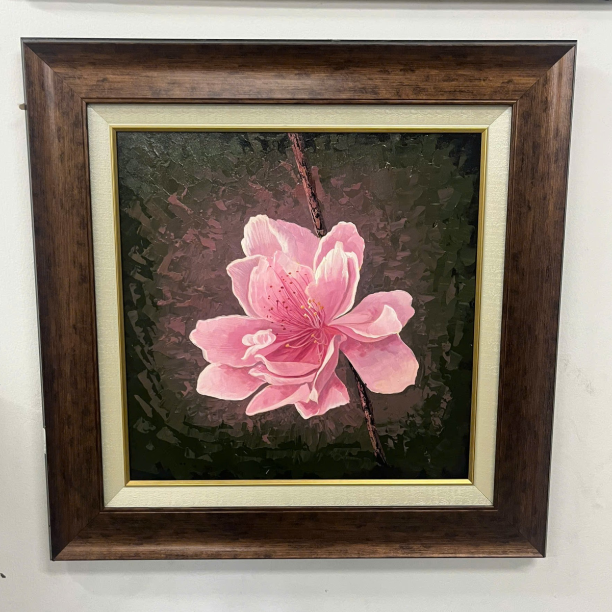 Bức tranh khắc họa vẻ đẹp dịu dàng của hoa anh đào – biểu tượng của tuổi trẻ và sức sống căng tràn. Cánh hoa hồng phấn mỏng manh nhưng rực rỡ, vươn lên giữa nền tối như ánh sáng của niềm tin và hy vọng. Tác phẩm gợi cảm giác thanh xuân ngắn ngủi mà quý giá, như lời nhắc về khoảnh khắc tươi đẹp nhất của đời người khi trái tim còn đầy nhiệt huyết và khát vọng vươn lên.